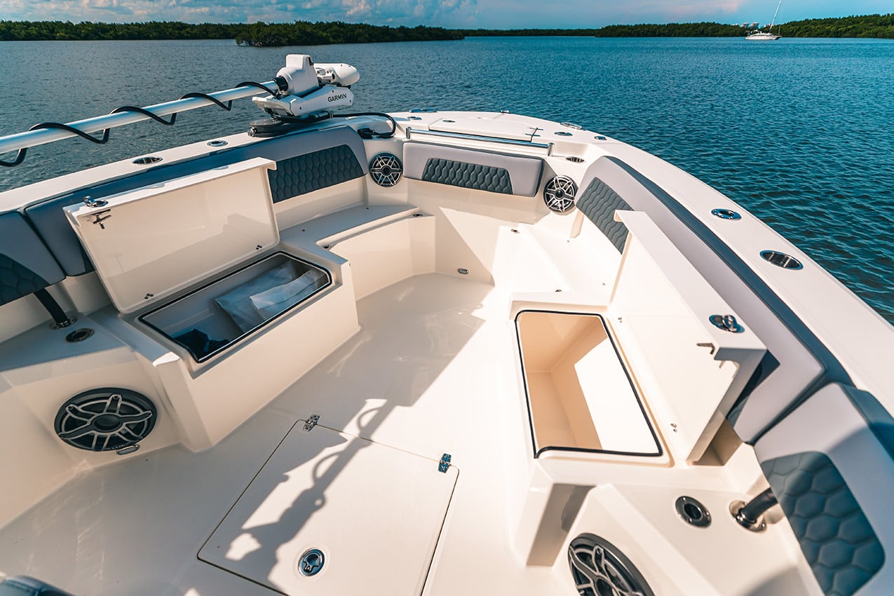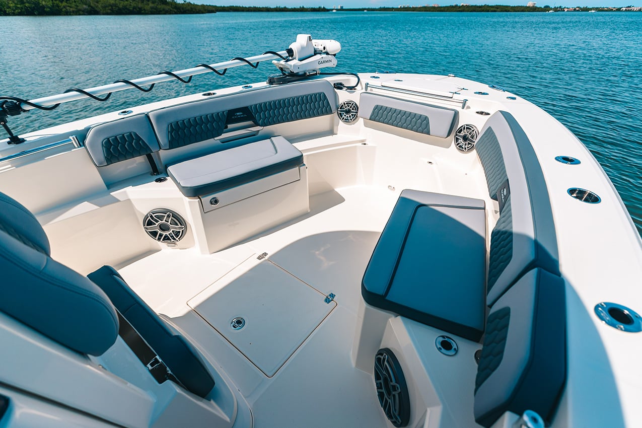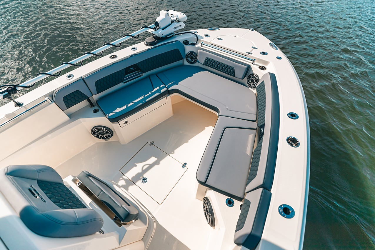 Additional upgrades include a Garmin Force Kraken trolling motor and enhanced JL Audio sound system packages with 10” subwoofers and up to 10 speakers that are strategically positioned to optimize the sound no matter where you are sitting, standing or fishing from on the boat.