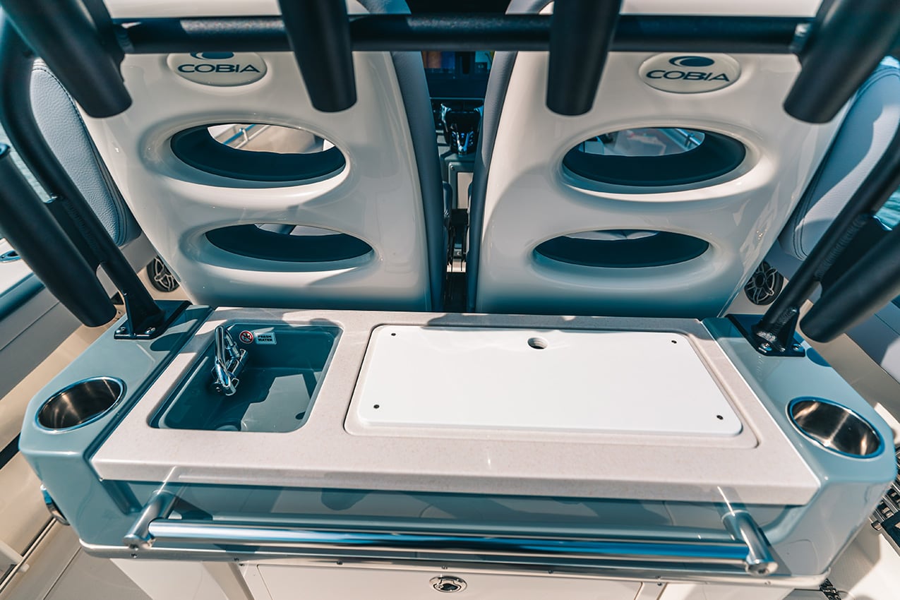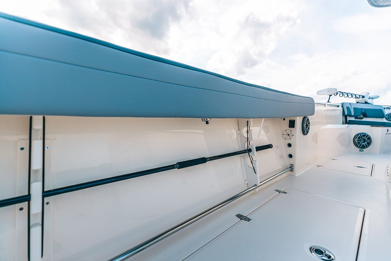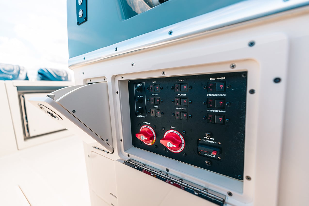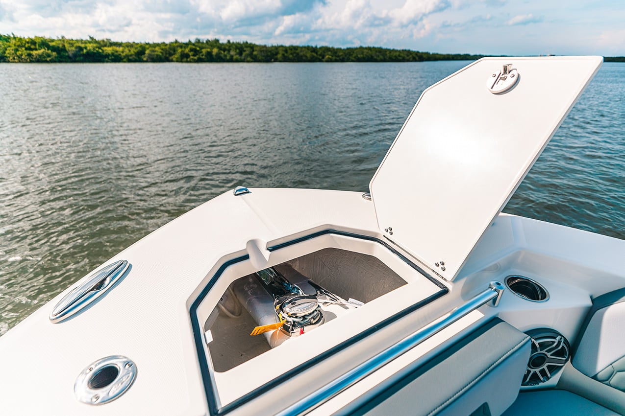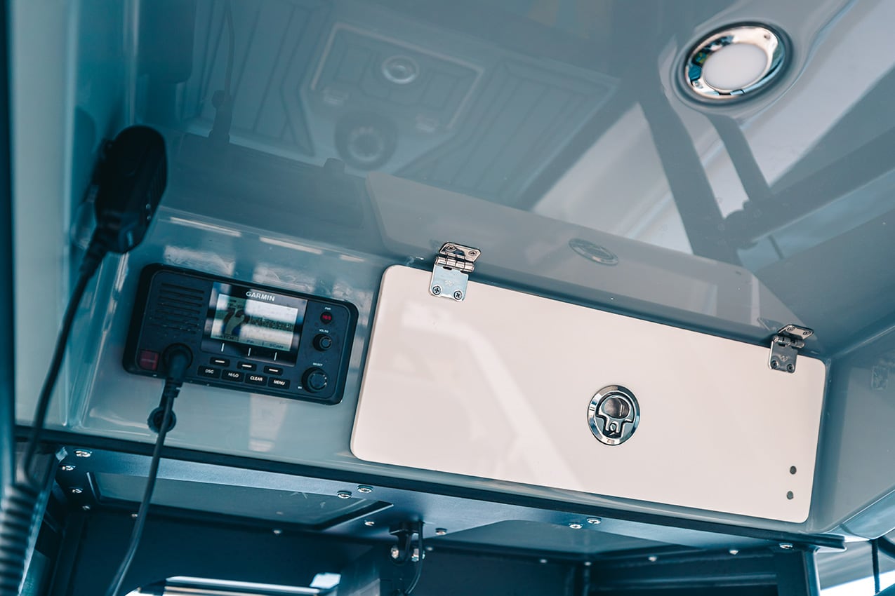 Option the user-friendly helm to fit your needs with room for dual 16″ flush-mounted screens for your Garmin electronics, black acrylic dash, VHF Radio, JL Audio sound system control, phone charging station, glove box and more.