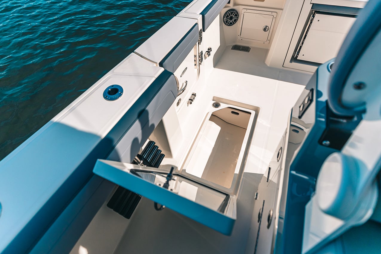 An enhanced angler-friendly layout features 4 cockpit insulated fish boxes with macerated overboard drains and a spacious deck with plenty of room to fight that fish from every side of the boat.
