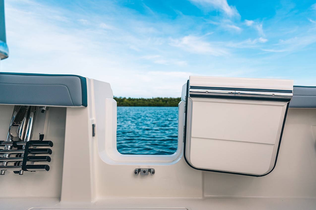 The side tuna door was designed with fishing and family in mind. Perfect for whether you are hauling in that big catch, using the ladder or reaching into the cooler for a cold drink without having to board the boat.